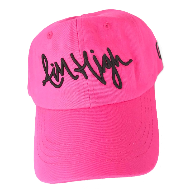 Pink Aim High hat with black text.